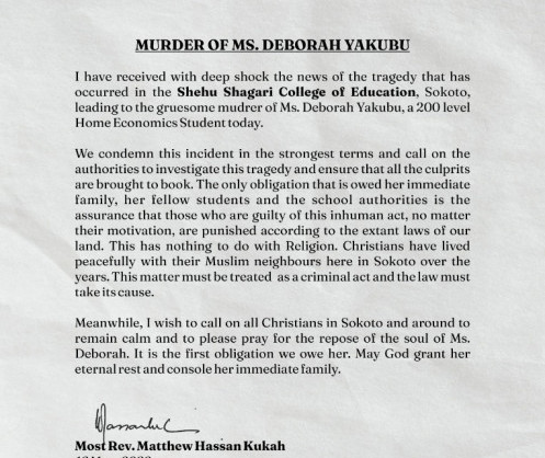 Bishop Kukah called on all Christians to remain calm and pray for the repose of the soul of Deborah Yakubu