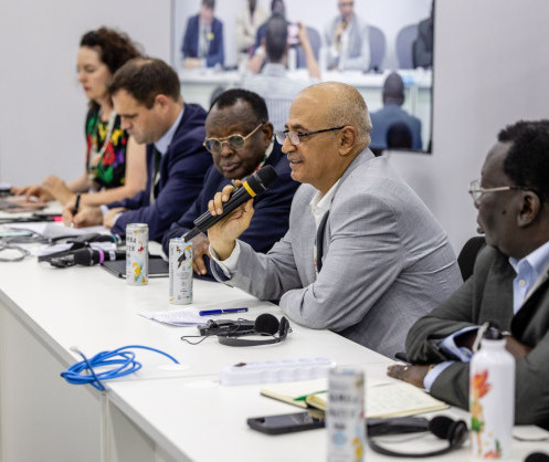 • Le ministre yéménite de l’Eau et de l’Environnement, M. Tawfiq Al-Sharjabi, s’exprimant lors d’un événement de la COP30 lançant la déclaration du Réseau IEACF. Crédit : Joel Sheakoski / ODI Global