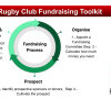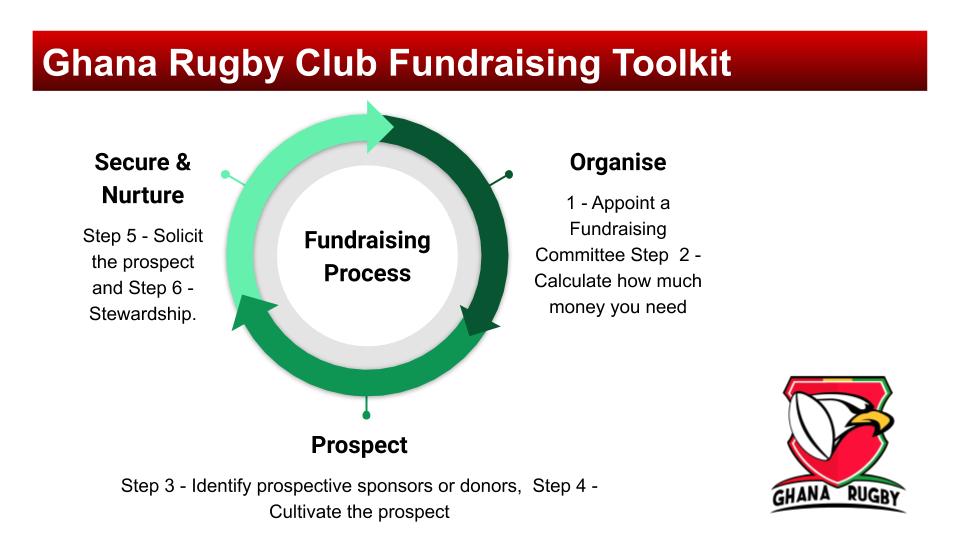 The  ‘Ghana Rugby Club Fundraising Plan Template’ outlines a process that includes: Step  1 - Appoint a Fundraising Committee Step, 2 - Calculate how much money you need, Step 3 - Identify prospective sponsors or donors,  Step 4 - Cultivate the prospect, Step 5 - Solicit the prospect and Step 6 - Stewardship.