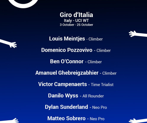 NTT Pro Cycling is delighted to announce our very exciting lineup for the 103rd Giro d’Italia which commences in Palermo on Saturday, 3 October and finishes in Milan on the 25th of October