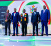 • Zimbabwe President H.E Emmerson D Mnangagwa flanked by Zim's Finance Minister Hon.Mthuli Ncube Afdb President Dr. A.A. Adesina Ambassador Nuno