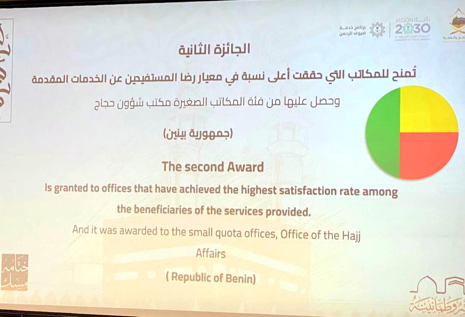 En effet, à la cérémonie de clôture du hadj 2024 le mardi dernier, le Bénin a été distingué dans la catégorie des Offices du Hadj à quota modeste, aux côtés de la Jordanie et de la Malaisie. C’est le deuxième prix décerné aux pays ayant réalisé la performance en termes de satisfaction des pèlerins quant aux services fournis. Cette reconnaissance de l’Arabie Saoudite vient approuver la vision du Gouvernement béninois pour le Hadj, soutenue par le Président de la République, Patrice TALON.