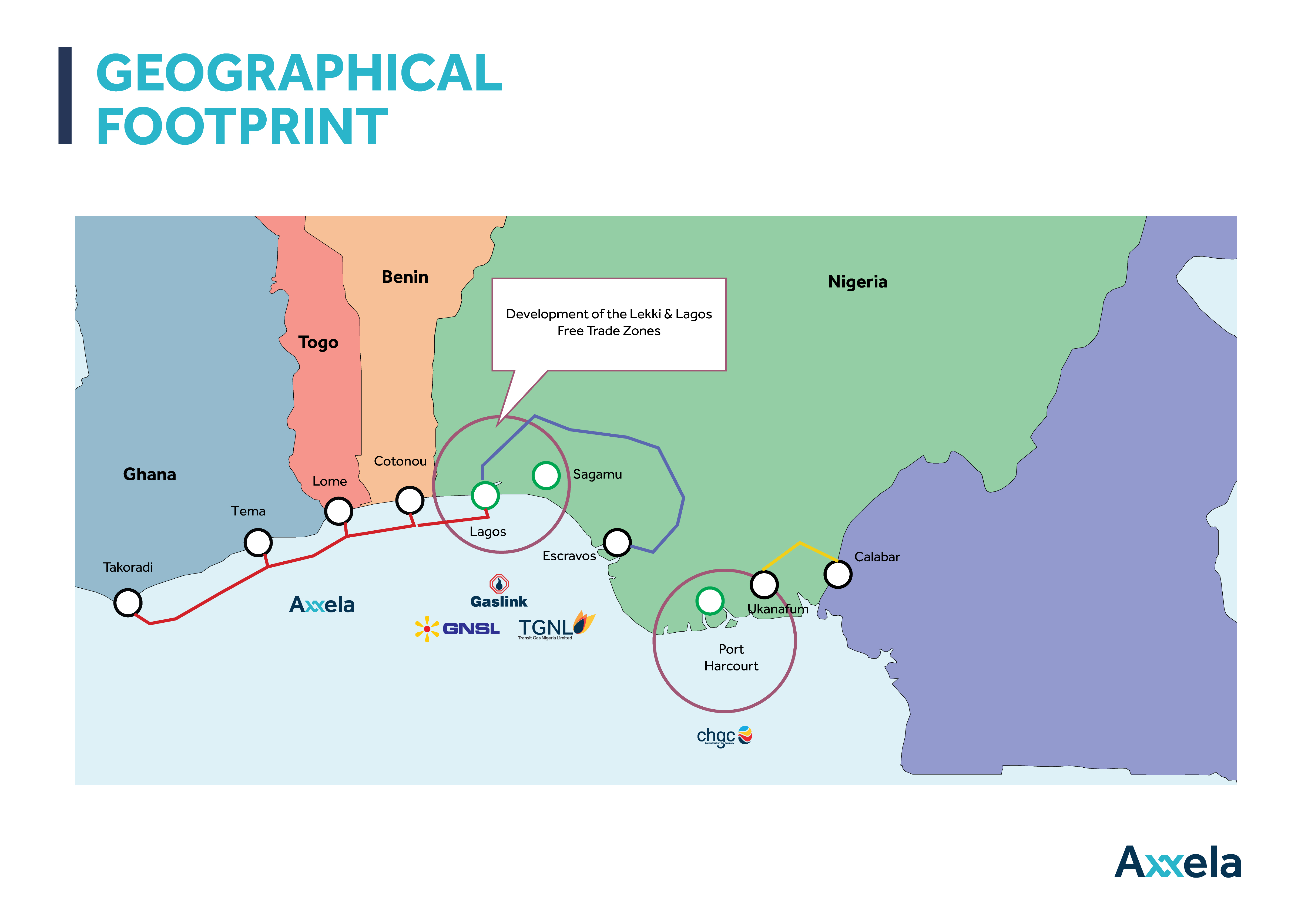Axxela Group began operations in 2001 and currently serves over 200 industrial customers across key industrial hubs in Lagos, Port Harcourt, and Sagamu providing a comprehensive energy offering across pipeline gas, compressed natural gas (CNG) and liquefied natural gas (LNG). It also supplies gas to power utilities and industries across the West Africa region, taking advantage of its status as a designated shipper on the West African Gas Pipeline (WAGP), a regional gas pipeline spanning across Benin, Togo and Ghana.