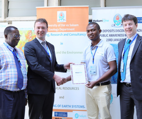 • Helium One’s Chief Executive Officer, Thomas Abraham-James hands a sponsorship certificate for a funded MSc programme at Oxford University to Karim Mtili, a graduate of BSc with Geology from University of Dar es Salaam. The sponsorship is geared towards imparting world-class technical skills and scientific expertise to Tanzanians. Witnessing this is Prof Christopher Ballentine from Oxford University and Prof Hudson Kotago from University of Dar es Salaam