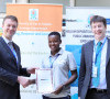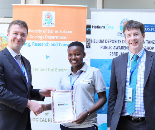• Helium One’s Chief Executive Officer, Thomas Abraham-James hands a sponsorship certificate for a funded MSc programme at Oxford University to Clara Kimani, a graduate of BSc with Geology from University of Dar es Salaam. The sponsorship is geared towards imparting world-class technical skills and scientific expertise to Tanzanians. Witnessing this is Prof Christopher Ballentine from Oxford University.