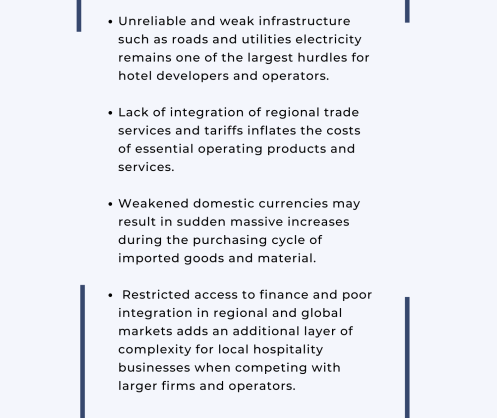 For locally grown African hospitality investors and operators, the supply chain challenges remain acute, and ramifications have meant consistent delays in the growing pipeline of projects, along with sometimes turbulent price fluctuations on shipping and logistics services, as well as effects of weakened domestic currencies.