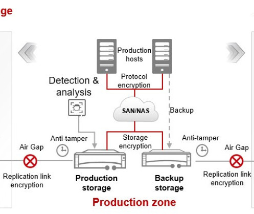 End-to-end encryption (data will not be leaked): Huawei storage ensures zero data leaks on the storage transmission network and storage through encryption of: protocol, production and backup storage, air-gap replication link, and remote replication transmission of data and backup copies. Even if hackers break the storage or intrude the storage network, they have no access to the confidential data thanks to the encryption deployment.