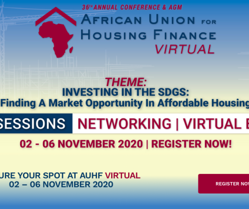 The 36th annual African Union for Housing Finance (AUHF) (www.AUHF.co.za) Virtual Conference & AGM (www.AUHFconference.com | 02-06 November 2020) will connect hundreds of senior African and international investors, financiers and developers online under the theme, “Investing in the SDGs: Finding a market opportunity in affordable housing, says its organiser and host Kecia Rust, of the AUHF Secretariat and the Centre for Affordable Housing Finance in Africa.