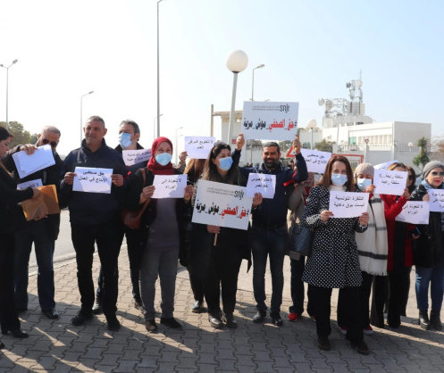 • أعضاء من "النقابة الوطنية للصحفيين التونسيين" يحتجون أمام مقر التلفزيون الحكومي، 11 مارس/آذار 2022. © 2022 النقابة الوطنية للصحفيين التونسيين