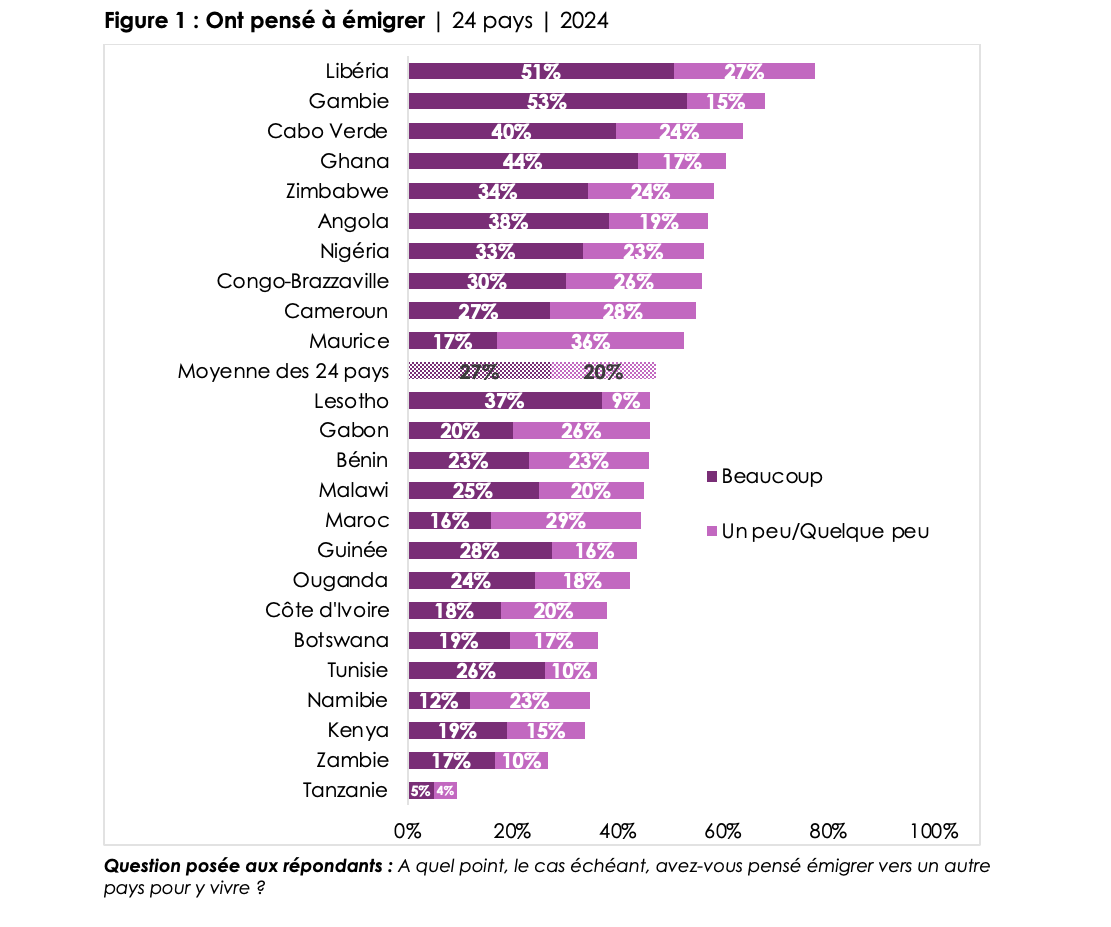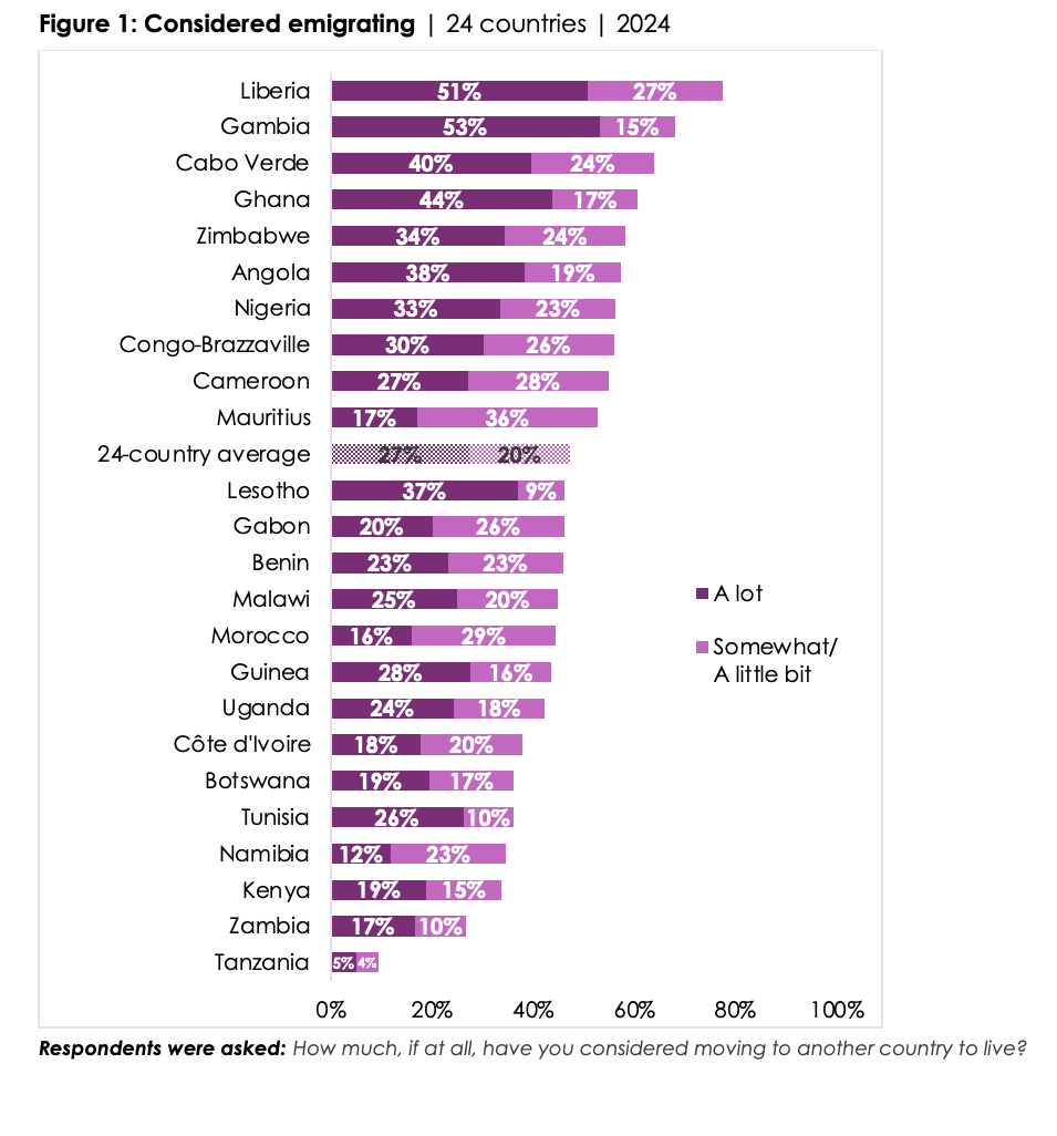 • On average across 24 African countries surveyed in 2024, almost half (47%) of respondents say they have considered moving to live in another country, including 27% who have given emigration “a lot” of thought (Figure 1).
