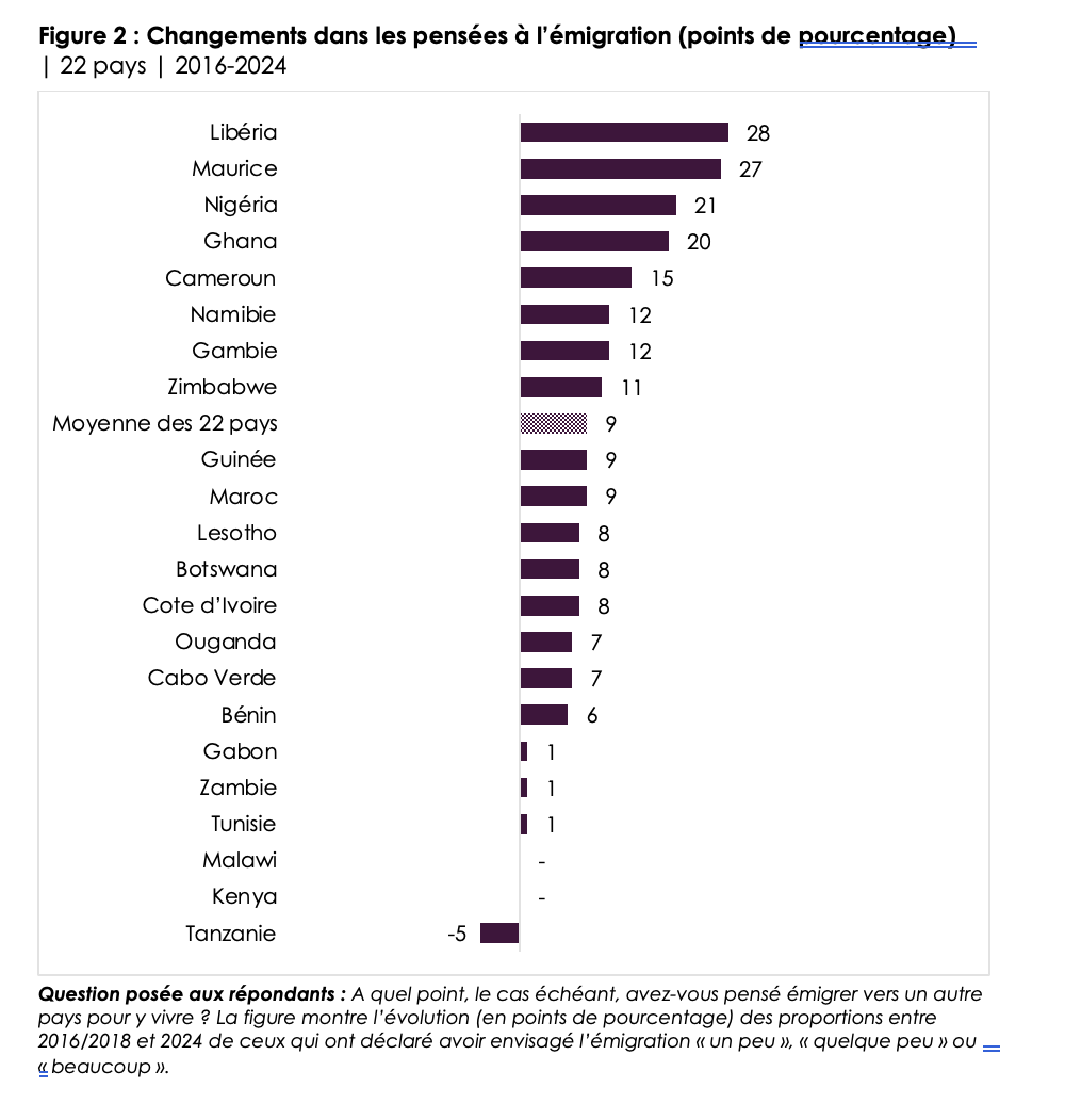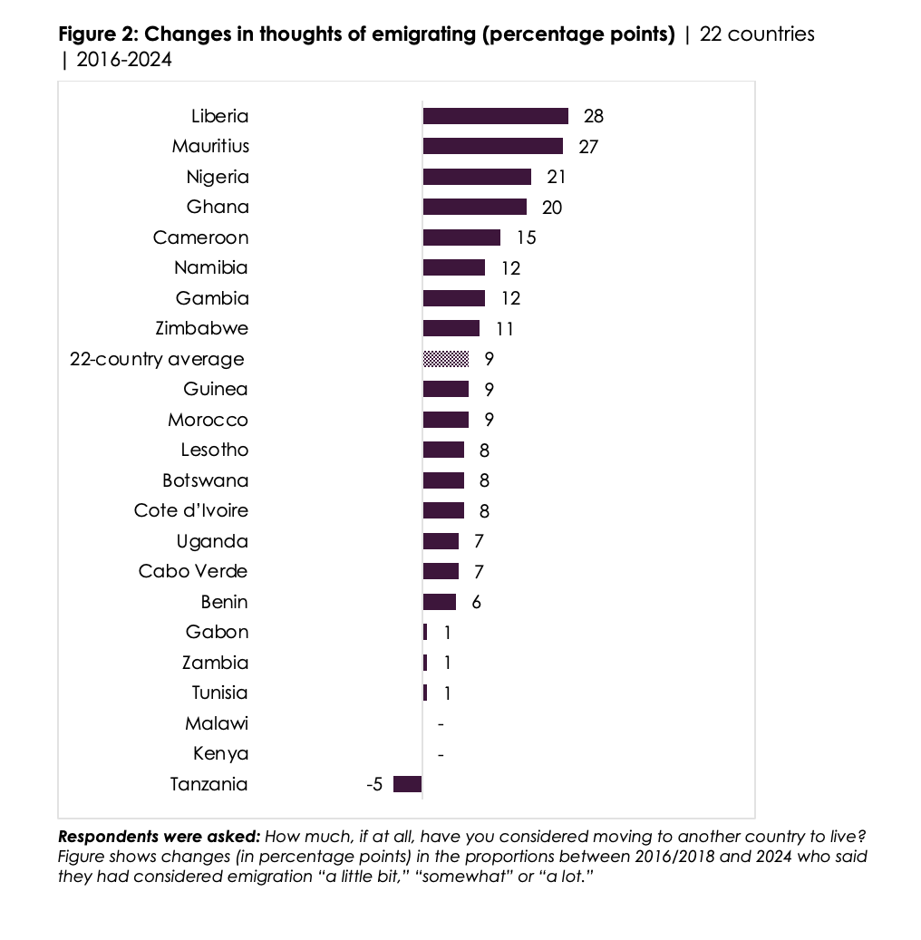 • On average across 22 countries surveyed consistently since 2016/2018, the share of citizens who have thought at least “a little bit” about emigration has increased by 9 percentage points, with double-digit increases recorded in Liberia (28 percentage points), Mauritius (27 points), Nigeria (21 points), Ghana (20 points), Cameroon (15 points), Namibia (12 points), the Gambia (12 points), and Zimbabwe (11 points) (Figure 2).