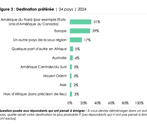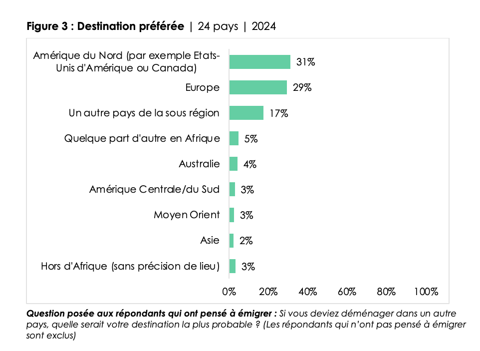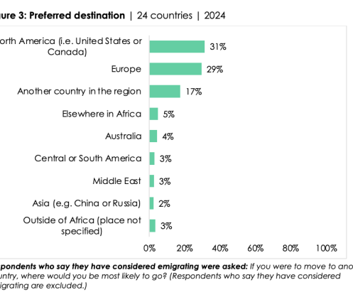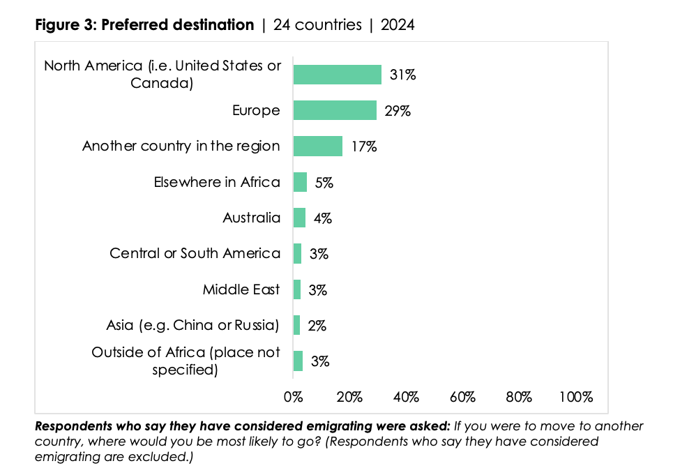 While the desire to migrate has increased in many countries, Tanzania stands out as the only country where emigration intentions have declined. North America and Europe are the most preferred destinations, although a significant proportion of potential migrants would prefer to relocate within Africa.