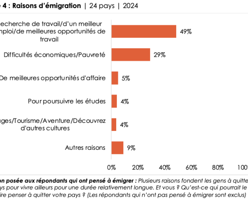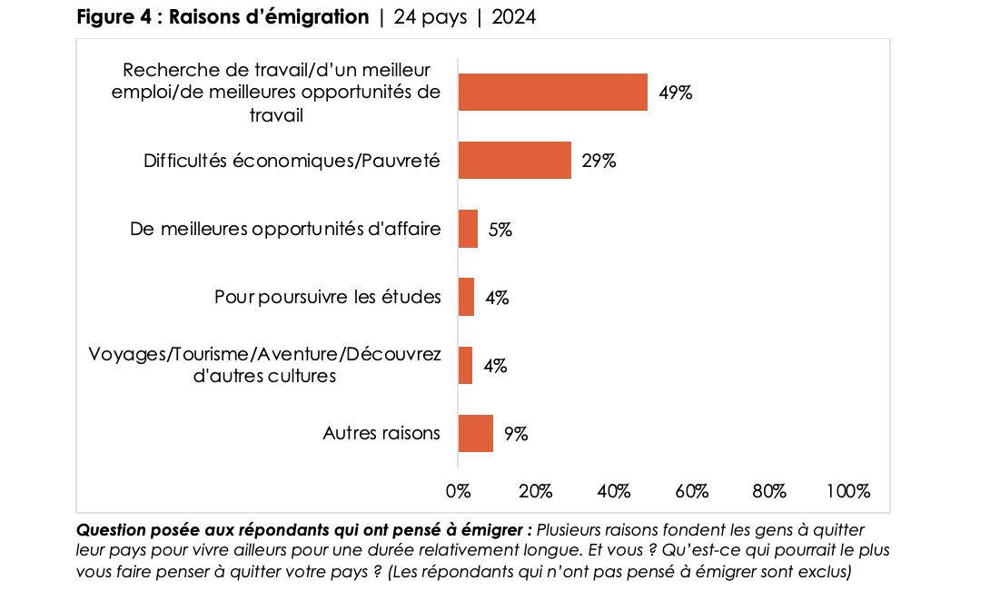 • Among those who have considered migrating, about half (49%) cite finding work as the most important reason, while 29% are motivated by a desire to escape economic hardship or poverty (Figure 4).