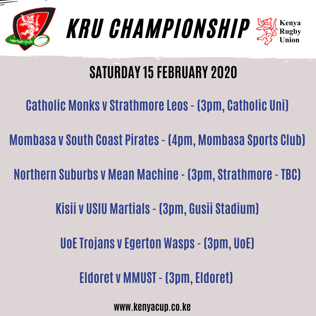 Ninth placed Catholic Monks host runaway leaders Strathmore Leos in Karen. The Leos were 40-10 first leg winners and will be keen to register their 14th win on the trot.