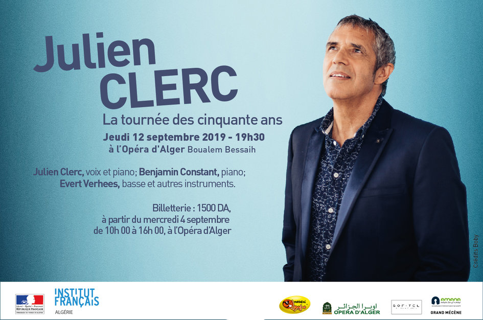 Depuis 1968, Julien Clerc enchaine les tubes tels que « Ce n’est rien », « Si on chantait », « Femmes.. je vous aime », « La fille aux bas nylon », « Mélissa », « Les séparés », ou encore « Laissons entrer le soleil ». Des titres qu’il vous invite à venir chanter avec lui, en chœur, à l’Opéra d’Alger, jeudi 12 septembre, à partir de 19h30.