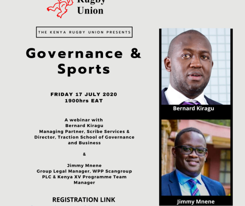 The weekly Kenya Rugby Union (https://www.KRU.co.ke/) webinars shift from technical matters to discuss governance in sports during the next session set for 1900hrs EAT on Friday 17 July 2020.