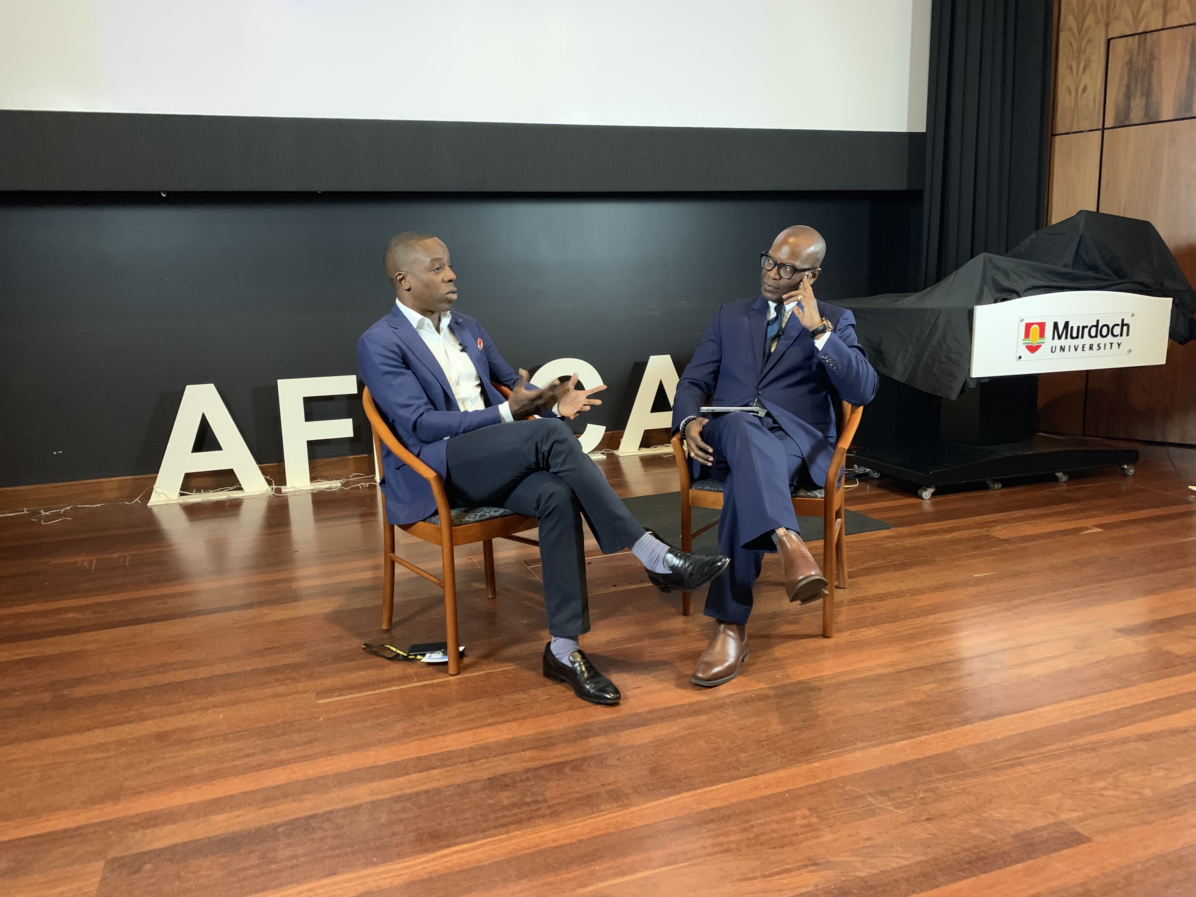 • (G) Kojo Annan, entrepreneur, dialoguant avec (D) Maximilian Jarrett, membre honoraire de l’Université Murdoch, lors du 9e Forum de recherche annuel Afrique-Australie à Perth