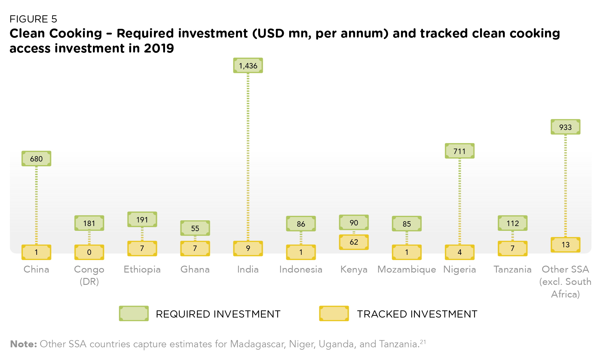Meanwhile, there is an abysmal amount of finance for clean cooking. Despite polluting cooking fuels causing millions of premature deaths each year and being the second largest contributor to climate change after carbon dioxide, only USD 133.5 million in finance for clean cooking solutions was tracked in 2019. This is nowhere near the estimated USD 4.5 billion in annual investment required to achieve universal access to clean cooking (accounting only for clean cookstove costs).