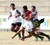 • Voahirana Marie Sophie Razafiarisoa de Madagascar plaquée par Celeste Adonis et Zenay Jordaan de l'Afrique du Sud lors du match de la Coupe du Monde Féminine de Rugby Africa au Bosman Stadium le 13 août 2019 à Johannesburg, Afrique du Sud