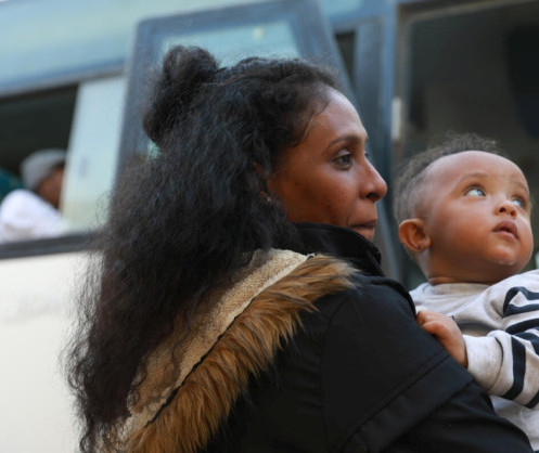 • An asylum seeker holds her baby as she prepares to board a bus taking them to the airport for a flight out of Libya. © UNHCR/Mohamed Alalem