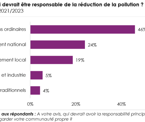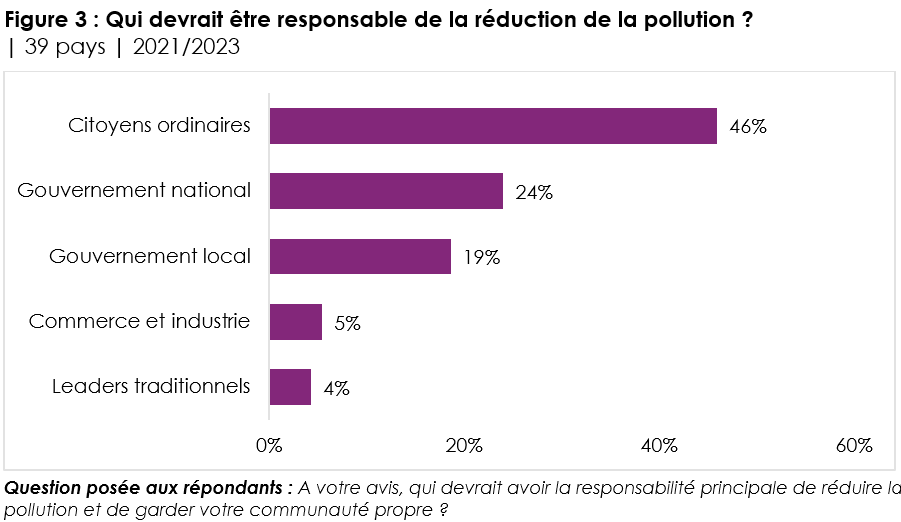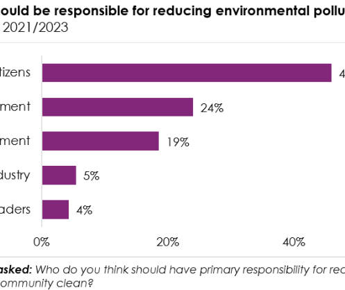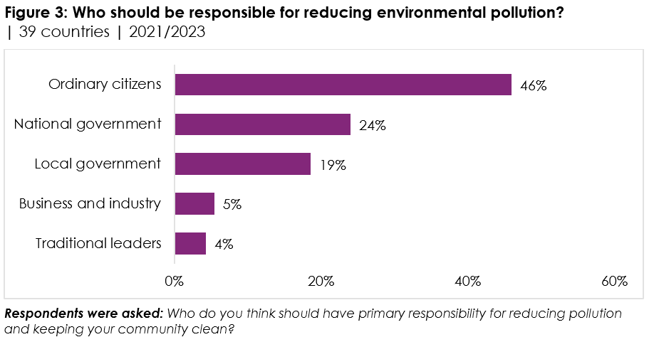 • Almost half (46%) of respondents say ordinary citizens bear the primary responsibility for reducing pollution and keeping communities clean, but nearly as many believe that the government – either national (24%) or local (19%) – should take the lead. Only a handful assign a primary role to business and industry (5%) (Figure 3).