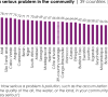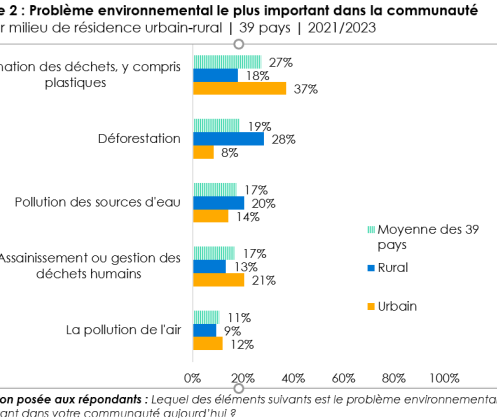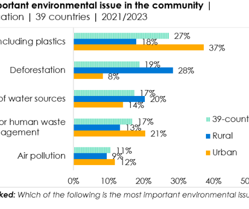 • Deforestation (28%) stands out as the foremost environmental concern in rural areas, while trash disposal (37%) tops the list in urban communities.