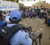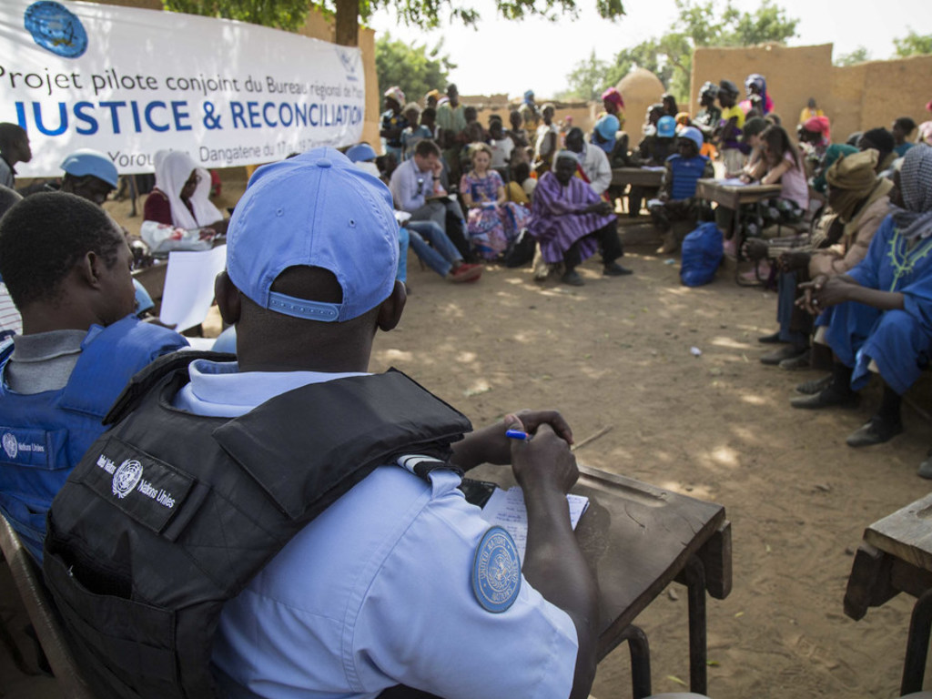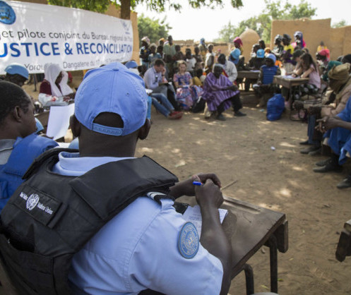 • Photo : MINUSMA / Gemma Cortes | Des Casques bleus de la Mission des Nations Unies au Mali (MINUSMA) mènent une réunion sur la justice et la réconciliation dans la région de Mopti, dans le centre du Mali