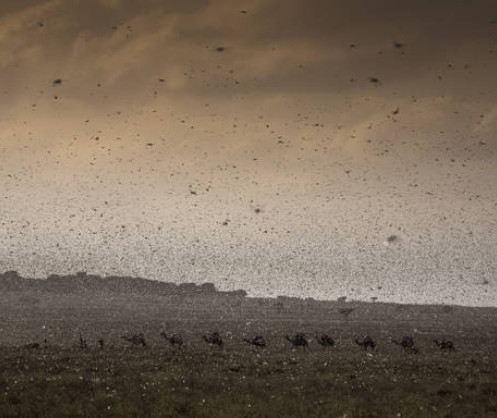 Ces essaims, dont chacun est potentiellement formé par des centaines de milliers de criquets pèlerins, sont capables de parcourir 150 kilomètres par jour et de ravager les moyens d'existence des populations rurales dans leur course effrénée pour se nourrir et se reproduire. Le criquet pèlerin dévore chaque jour l'équivalent de son propre poids, soit environ deux grammes.
