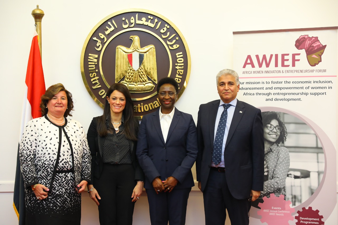 L to R: Nevine Abdelkhalek, Board Member, Egyptian Businessmen’s Association (EBA), H. E. Dr. Rania Al-Mashat, Minister for International Cooperation, Egypt, Irene Ochem, AWIEF Founder & CEO, and Mohamed Youssef, Executive Director, EBA, at a joint press conference held at the Ministry of International Cooperation’s offices in Cairo, Egypt, on 10 May 2022 to announce Egypt as the host country for AWIEF2022. (Source: Africa Women Innovation and Entrepreneurship Forum (AWIEF) | 3 years ago)