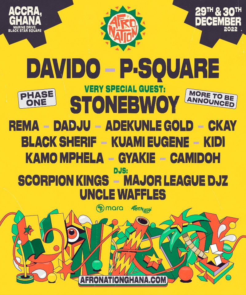 Afro Nation Ghana Announces Huge Line Up for December 29th-30th 2022: Davido, P-Square, plus very special guest Stonebwoy, joined by Rema, Dadju, Adekunle Gold, CKay, and many more