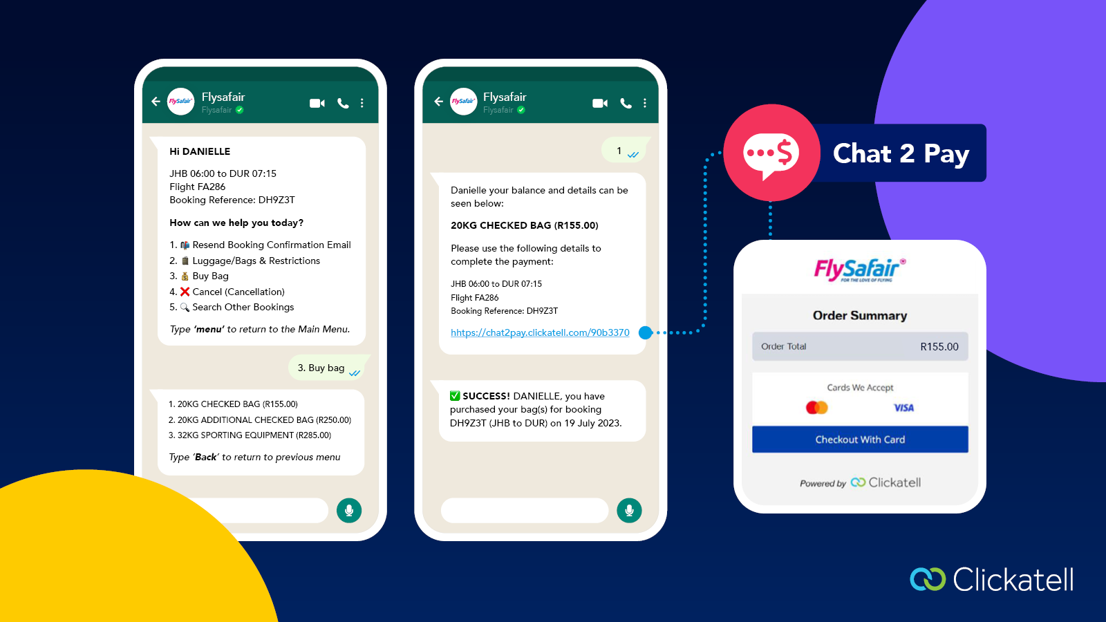Together with Clickatell, FlySafair is the first airline in the world to deploy Chat 2 Pay, a pay-by-link capability that gives customers convenience of WhatsApp mobile payments (Source: Clickatell | 2 years ago)