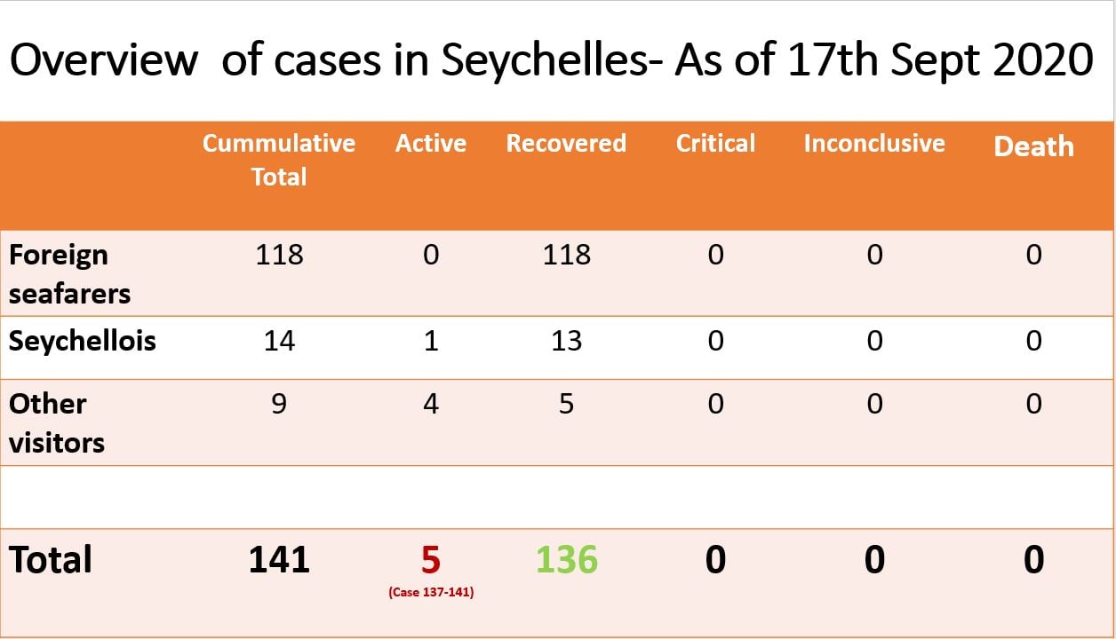 Coronavirus - Seychelles: Overview of Cases in Seychelles as of 17th September 2020 (Source: Department of Health, Seychelles | 5 years ago)