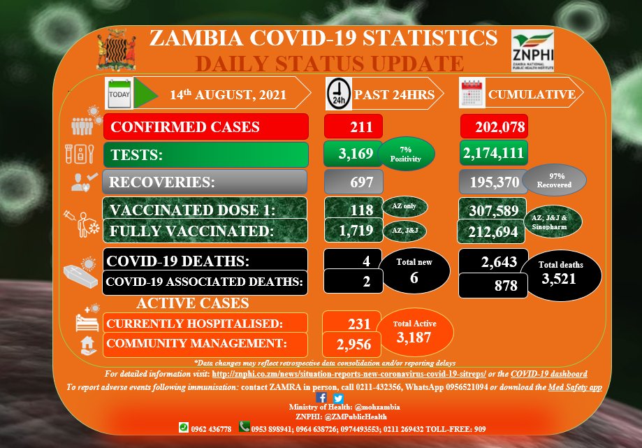 Coronavirus - Zambia: COVID-19 Statistics Daily Status Update (14 August 2021)