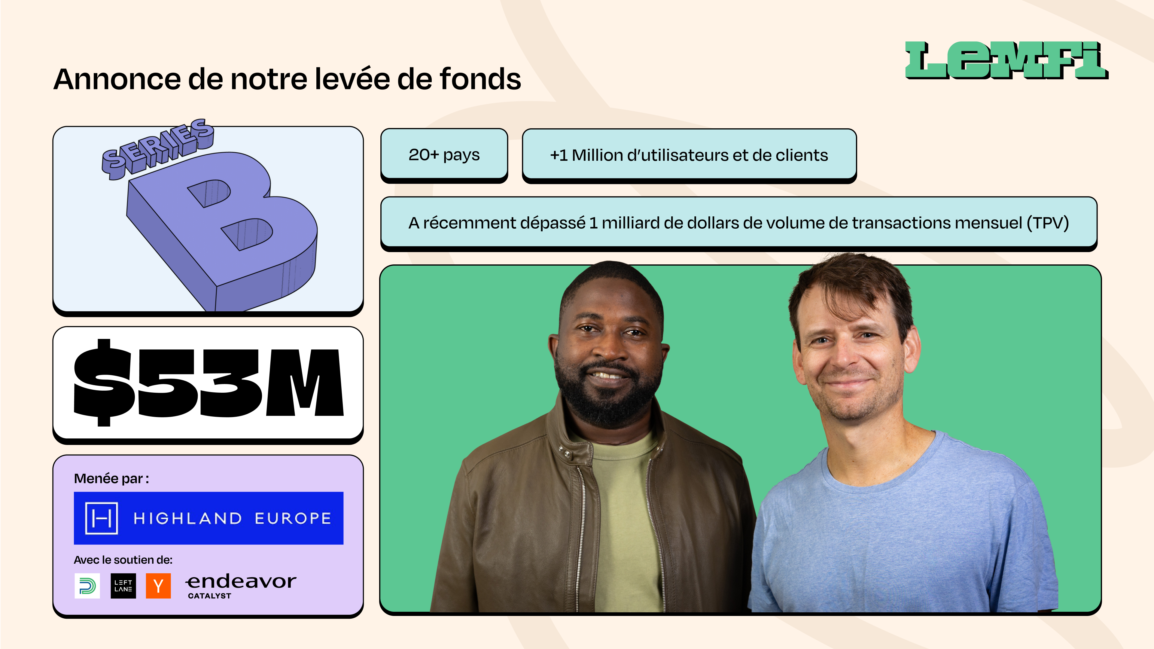 LemFi, la plateforme de services financiers de confiance conçue pour les immigrants, lève 53 millions de dollars lors d'un financement de série B mené par Highland Europe (1) (EN) (Source: LemFi | 1 year ago)