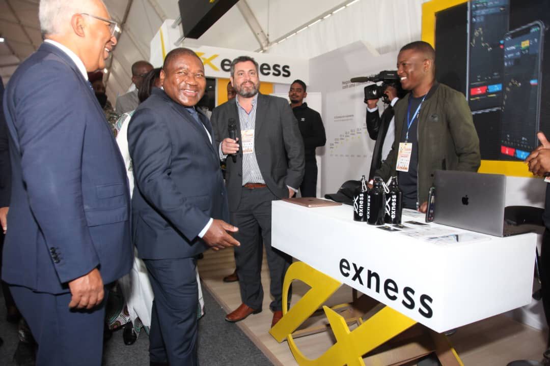 O Presidente de Moçambique, Filipe Nyusi, e o Primeiro-Ministro de Portugal, António Costa, visitam o stand da Exness na Feira de Negócios Internacional de Maputo (FACIM)