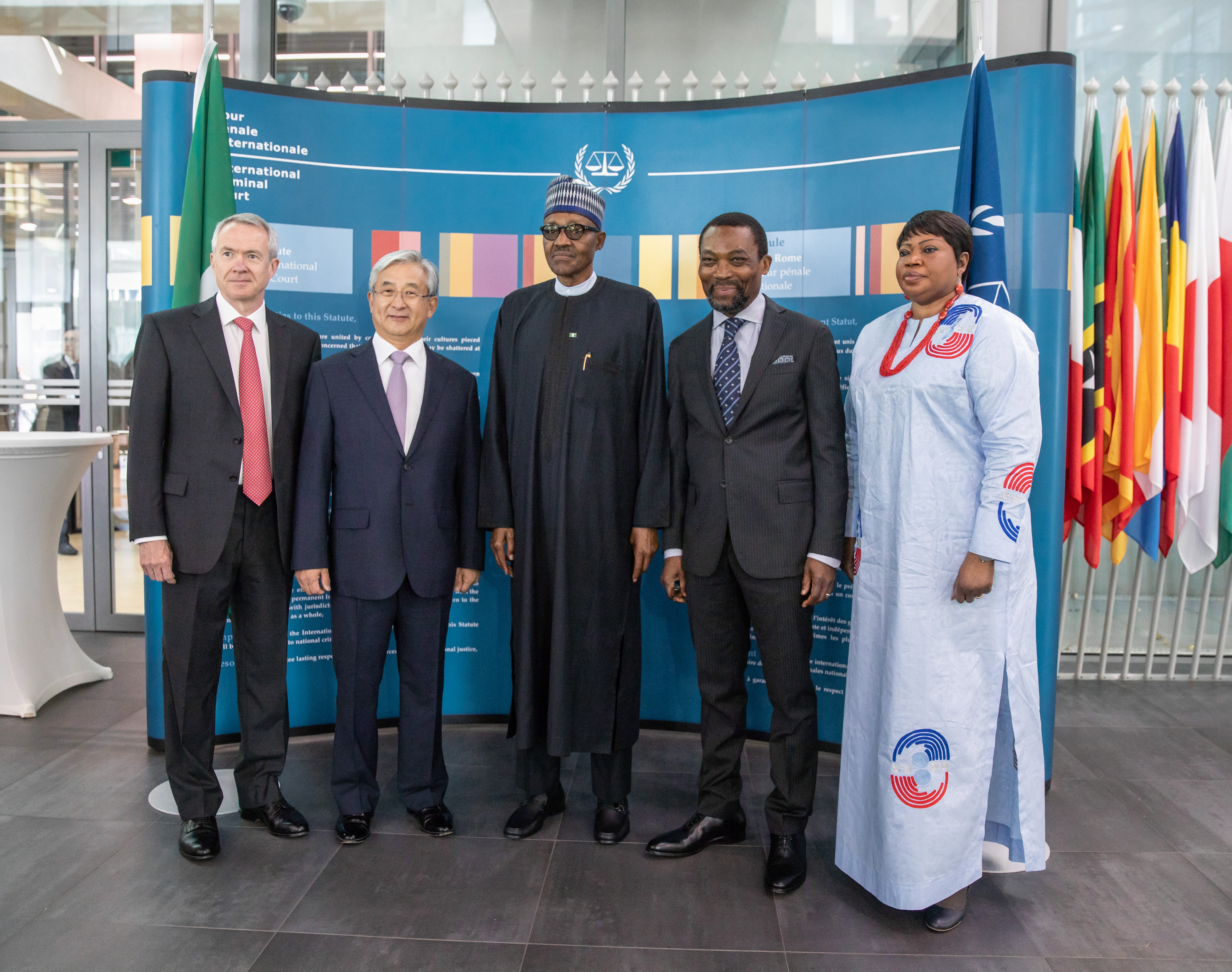 (Left to right) ICC Registrar Mr Peter Lewis, ASP President H.E. O-Gon Kwon, President of Nigeria H.E. Muhammadu Buhari, ICC President Judge Chile Eboe-Osuji and ICC Prosecutor Fatou Bensouda at the high-level commemorations of the Rome Statute’s anniversary on 17 July 2018 ©ICC-CPI (Source: International Criminal Court (ICC) | 7 years ago)