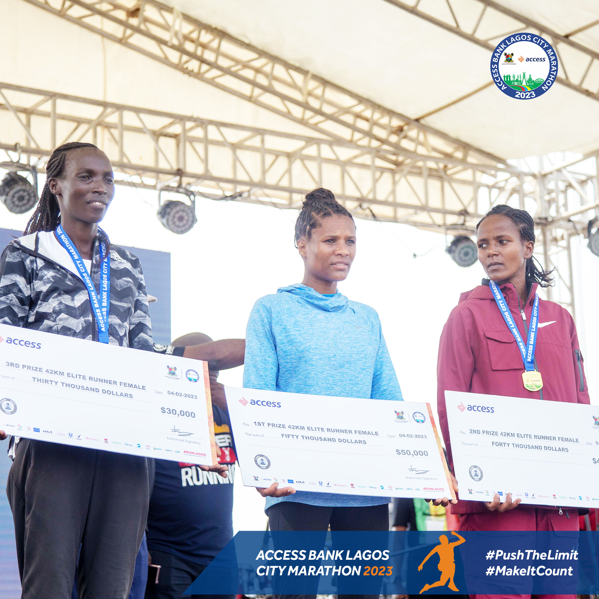 Women's Elite Runners at Access Bank Lagos City Marathon 2023, 3rd Prize Winner, Naomi Maiyo of Kenya, 1st Prize Winner, Guta Alemenesh Herpha of Ethiopia, and 2nd Prize winner, Urisa Kebene Chala of Ethiopia (Source: Access Bank PLC | 3 years ago)