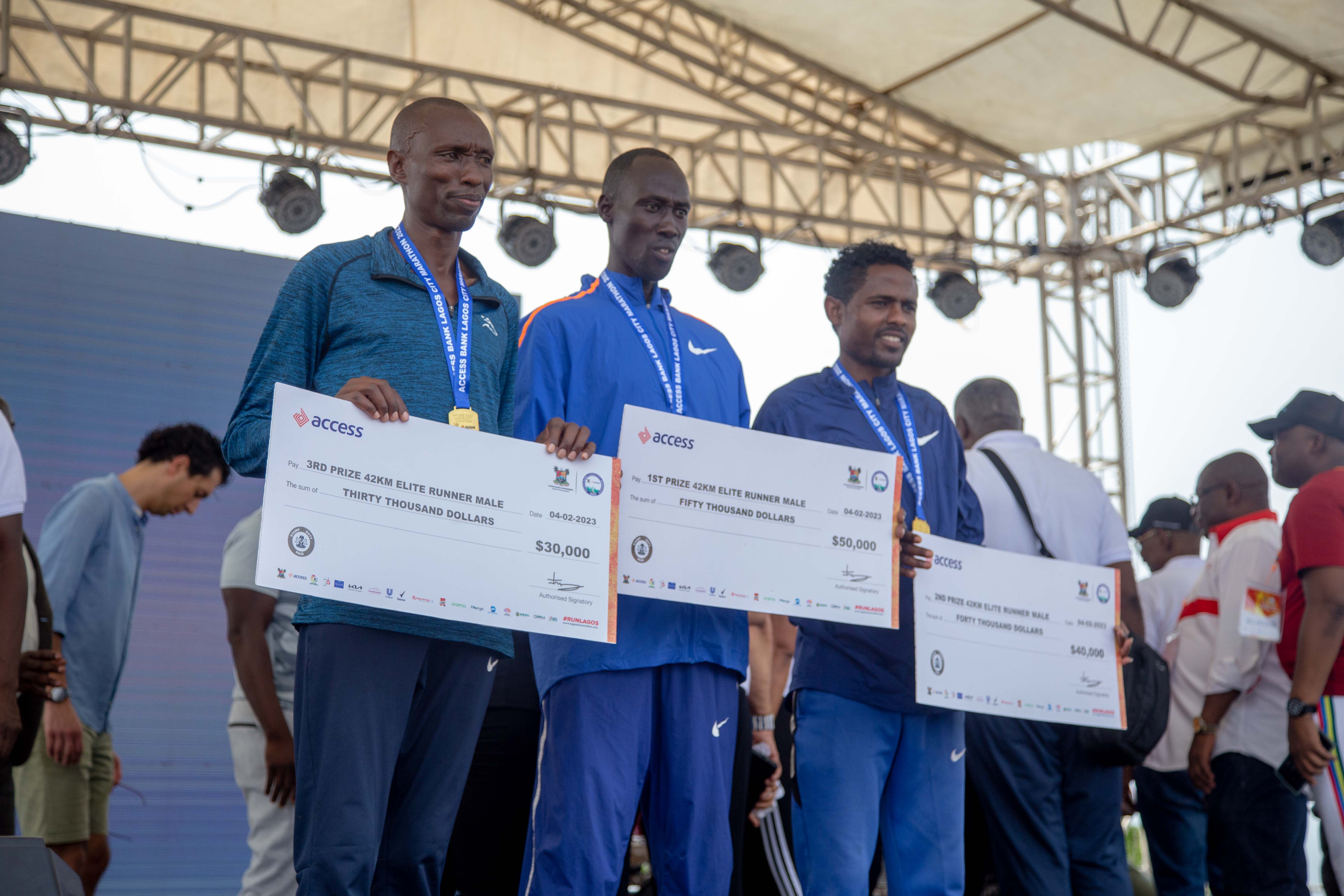 (L-R)Men's Elite Runners at Access Bank, Lagos City Marathon 2023.3rd Prize Winner, Dekeba Shefa of Ethiopia, 1st Prize Winner, Kibert Koch of Kenya & 2nd Prize Winner, Bernard Sang of Kenya (Source: Access Bank PLC | 3 years ago)