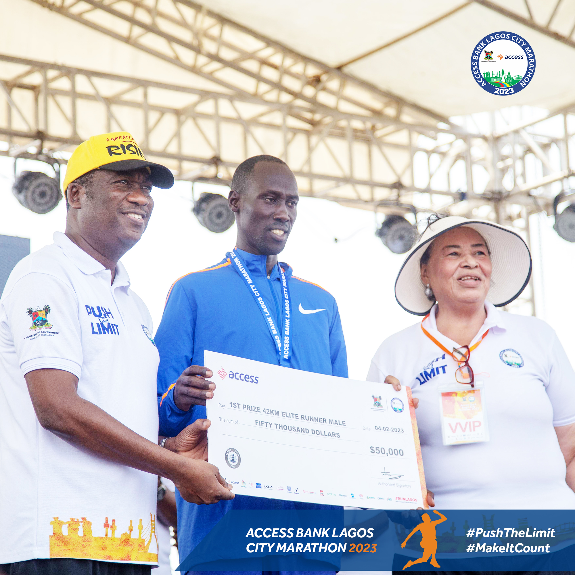 (L-R) Deputy Governor of Lagos, Obafemi Hamzat, Winner of the Elite Runner Men's Prize,Edwin Kibet Koech of Kenya & Chairperson, Access Bank PLC,Ajoritsedere Awosika HD (Source: Access Bank PLC | 3 years ago)