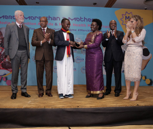 The winner of Merck More Than a Mother Media Recognition Awards 2017 in Multimedia category of Ms. Namukabo L Werungah and the team from NTV Kenya with William Pike is the Managing Director of the Star Newspaper, Dr. Rashid A. Aman, Chief Administrative Secretary, Ministry of Health, Kenya, Dr Rasha Kelej, CEO Merck Foundation, Hon. Sarah Opendi- Minister of State of Health, Uganda and Mr. Tom Mshindi is the Group Editor-In-Chief at Nation Media Group (NMG)