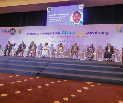 • Hon. Dr. Thadée NDIKUMANA Ministre de la Santé Publique et de la Lutte contre le SIDA, République du Burundi, Hon. Jappie Chancy Mtuwa Mhango Ministre de la santé et de la population, République du Malawi, l'hon. Prof. Mahamoud Youssouf KHAYAL Ministre de la santé publique, République du Tchad, Hon. Dr. Hon. Dr. Ahmadou Samateh Ministre de la Santé, République de Gambie, Hon. Sarah Opendi Ministre d'État au développement minier (ancienne ministre de la Santé), République d'Ouganda, Dr Rasha Kelej PDG de la Fondation Merck Coprésidente de Merck Africa Asia Luminary, l'hon. Dr Obadiah Moyo Ministre de la santé et des soins aux enfants, République du Zimbabwe, l'hon. Dr. Wilhemina S. Jallah Ministre de la santé, République du Libéria, Dr. Rasha Kamal Chef de l'administration centrale pour les affaires internationales des étudiants, Ministère de l'enseignement supérieur et de la recherche scientifique, République arabe d'Égypte, Hon. Dr Chitalu Chilufya Ministre de la Santé, République de Zambie lors d'un panel ministériel de haut niveau à la 6e édition de Merck Africa Asia Luminary 2019 à Accra, Ghana