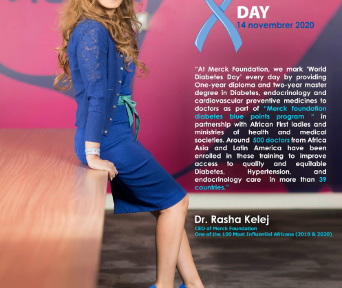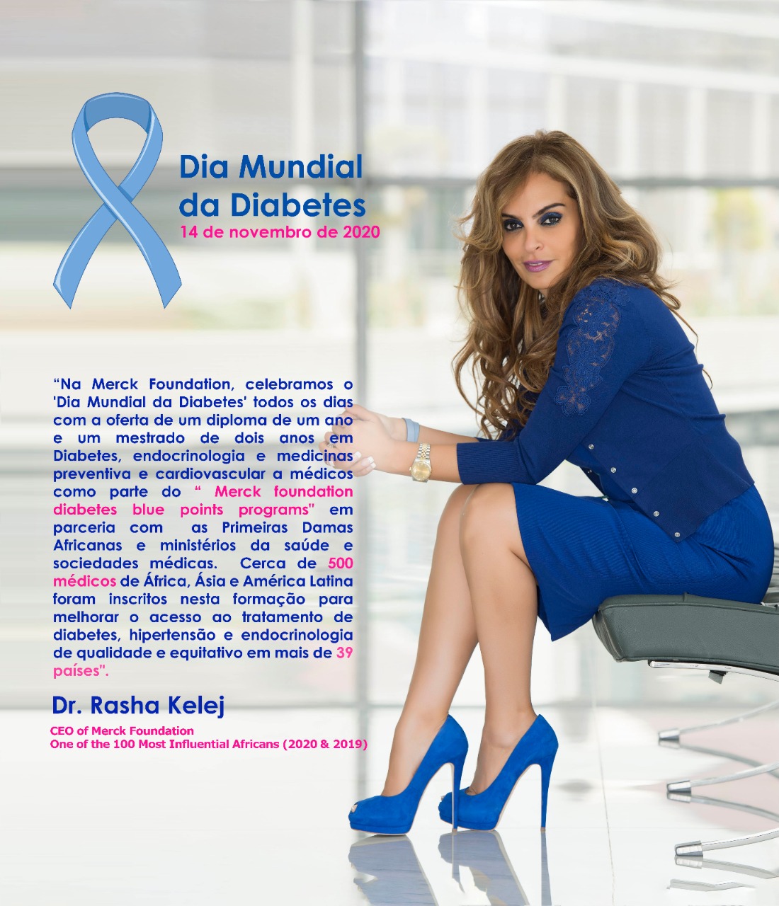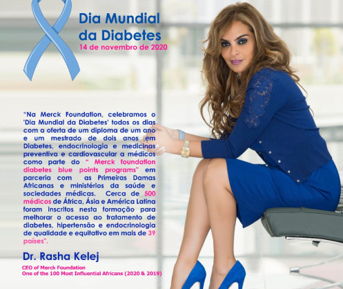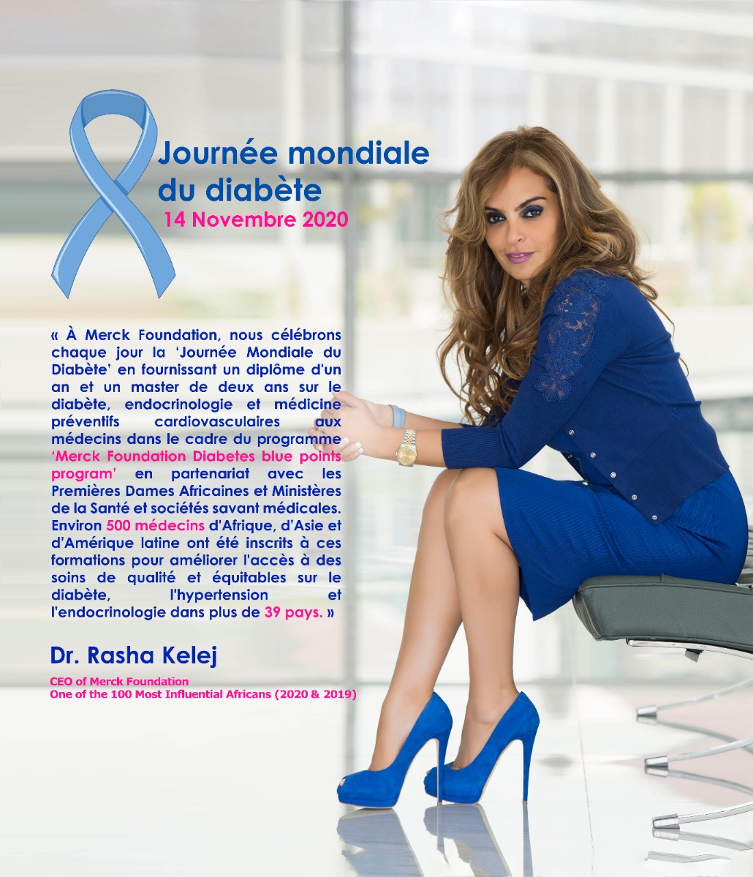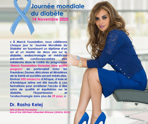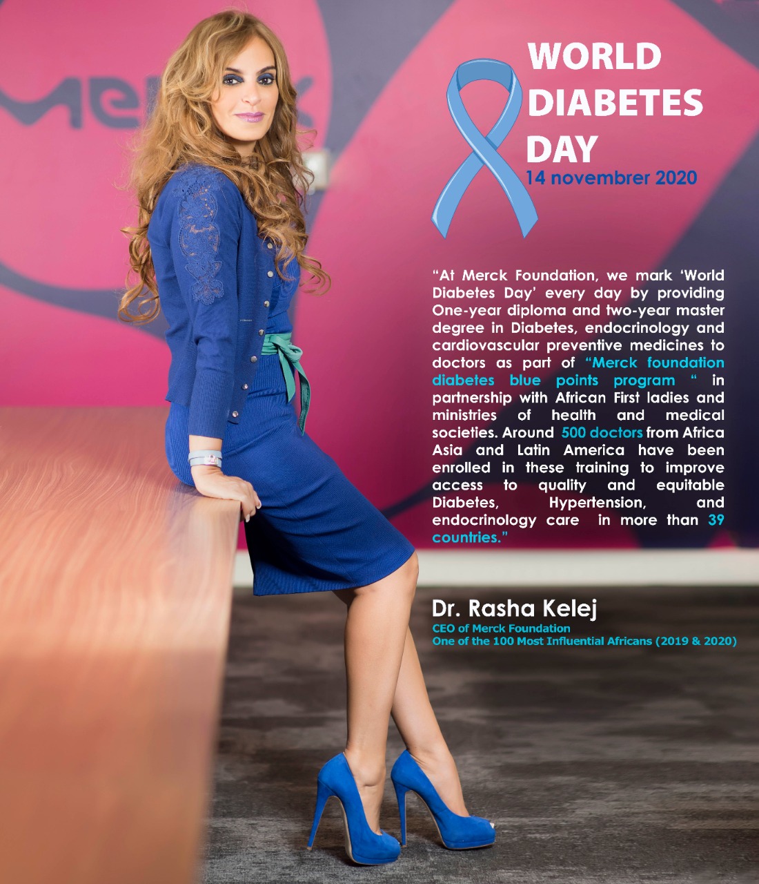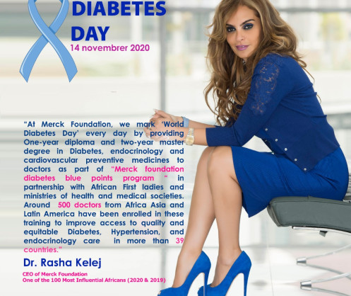 Dr. Rasha Kelej, CEO of Merck Foundation and One of 100 Most Influential Africans (2019, 2020) a expliqué : « À la Fondation Merck, nous célébrons chaque jour la 'Journée Mondiale du Diabète' en fournissant un diplôme d'un an et un master de deux ans en diabète, endocrinologie et médicine préventifs cardiovasculaires aux médecins dans le cadre du programme ‘Merck Foundation Diabetes Blue Points Program’ en partenariat avec les Premières Dames d'Afrique, les Ministères de la Santé et les Sociétés Médicales. Je suis très fière d'annoncer qu'environ 500 médecins de 39 pays d'Afrique, d'Asie et d'Amérique latine se sont inscrits à ces cours. Notre objectif est d'améliorer l'accès à des soins de qualité et équitables pour le diabète, l'hypertension et l'endocrinologie sur les trois continents. Nous allons nous étendre à plus de pays dans l'année à venir ».