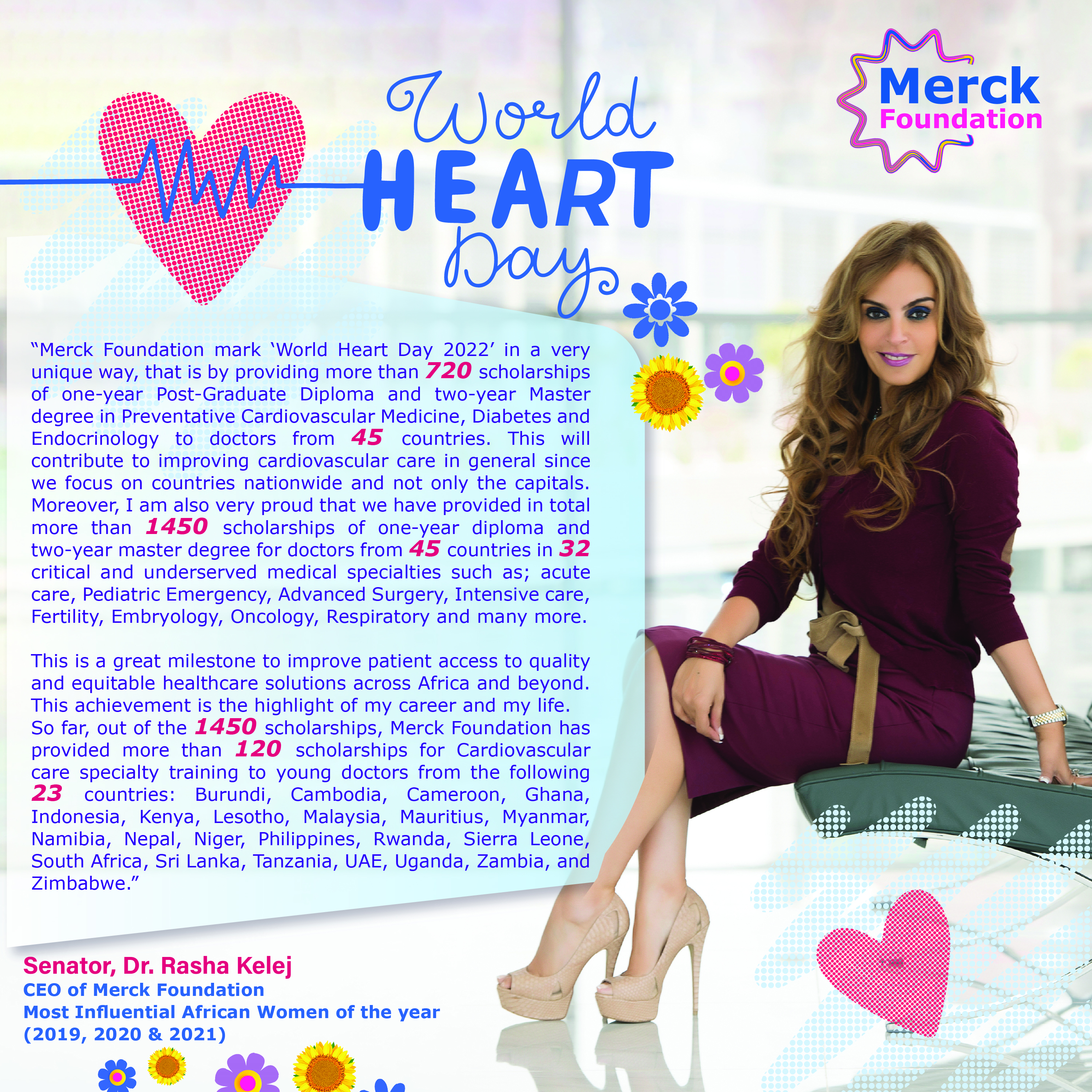 Senator, Dr. Rasha Kelej, CEO of Merck Foundation emphasized, “Merck Foundation mark ‘World Heart Day 2022’ in a very unique way, that is by providing more than 720 scholarships of one-year Post-Graduate Diploma and two-year Master degree in Preventative Cardiovascular Medicine, Diabetes and Endocrinology to doctors from 45 countries. This will contribute to improving cardiovascular care in general since we focus on countries nationwide and not only the capitals. Moreover, I am also very proud that we have provided in total more than 1450 scholarships of one-year diploma and two-year master degree for doctors from 45 countries in 32 critical and underserved medical specialties such as; acute care, Pediatric Emergency, Advanced Surgery, Intensive care, Fertility, Embryology, Oncology, Respiratory and many more.