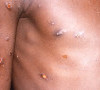 • Monkeypox produces skin lesions, fever, and body aches in people affected with the virus. Image source: CDC