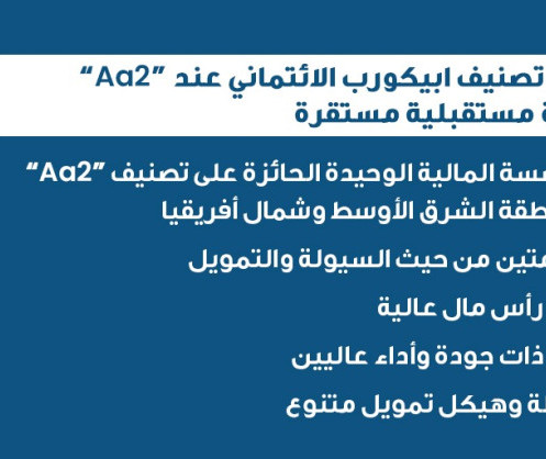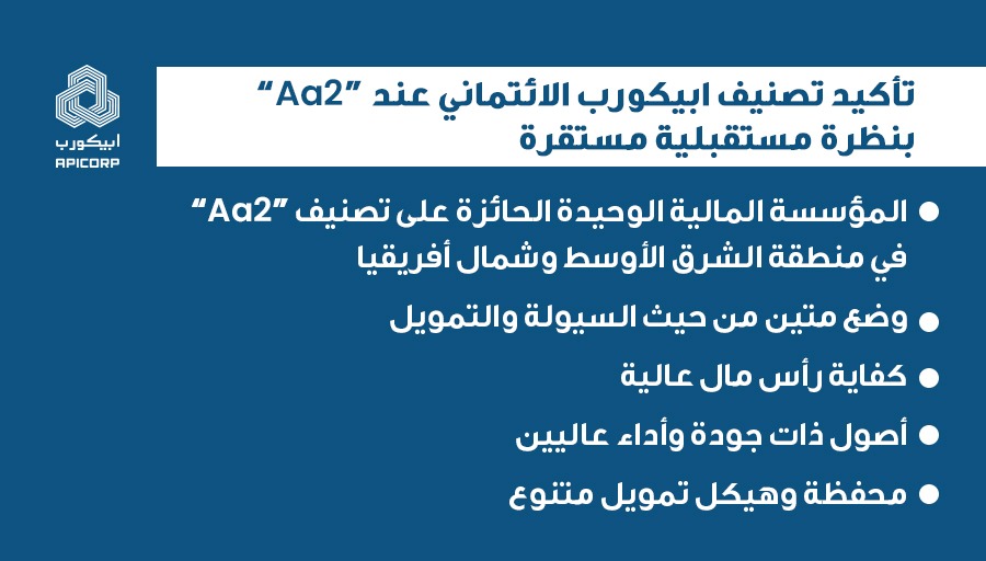 APICORP (www.APICORP.org) continue d’être le seul établissement financier de la région ANMO à être noté « Aa2 » ; Cette notation est confirmée sur la base de la solide adéquation des fonds propres, de la haute qualité des actifs et du rendement élevé affichés par APICORP ; L’abondance des liquidités et la diversification de la structure de financement renforcent la position financière ; APICORP fait preuve de résilience dans un contexte opérationnel compliqué grâce à son portefeuille diversifié et à l’excellence de sa gestion.