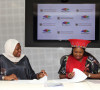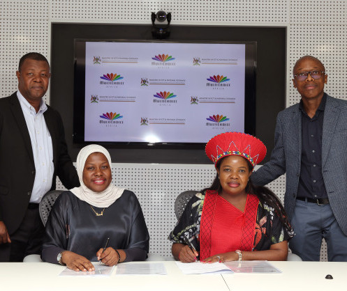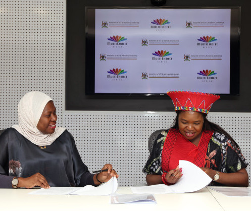 • Dr Aminah Zawedde, the PS, Ministry of ICT and National Guidance of Uganda and Fhulufhelo Badugela, the CEO for MultiChoice Africa Holdings signing the MoU in Randburg yesterday