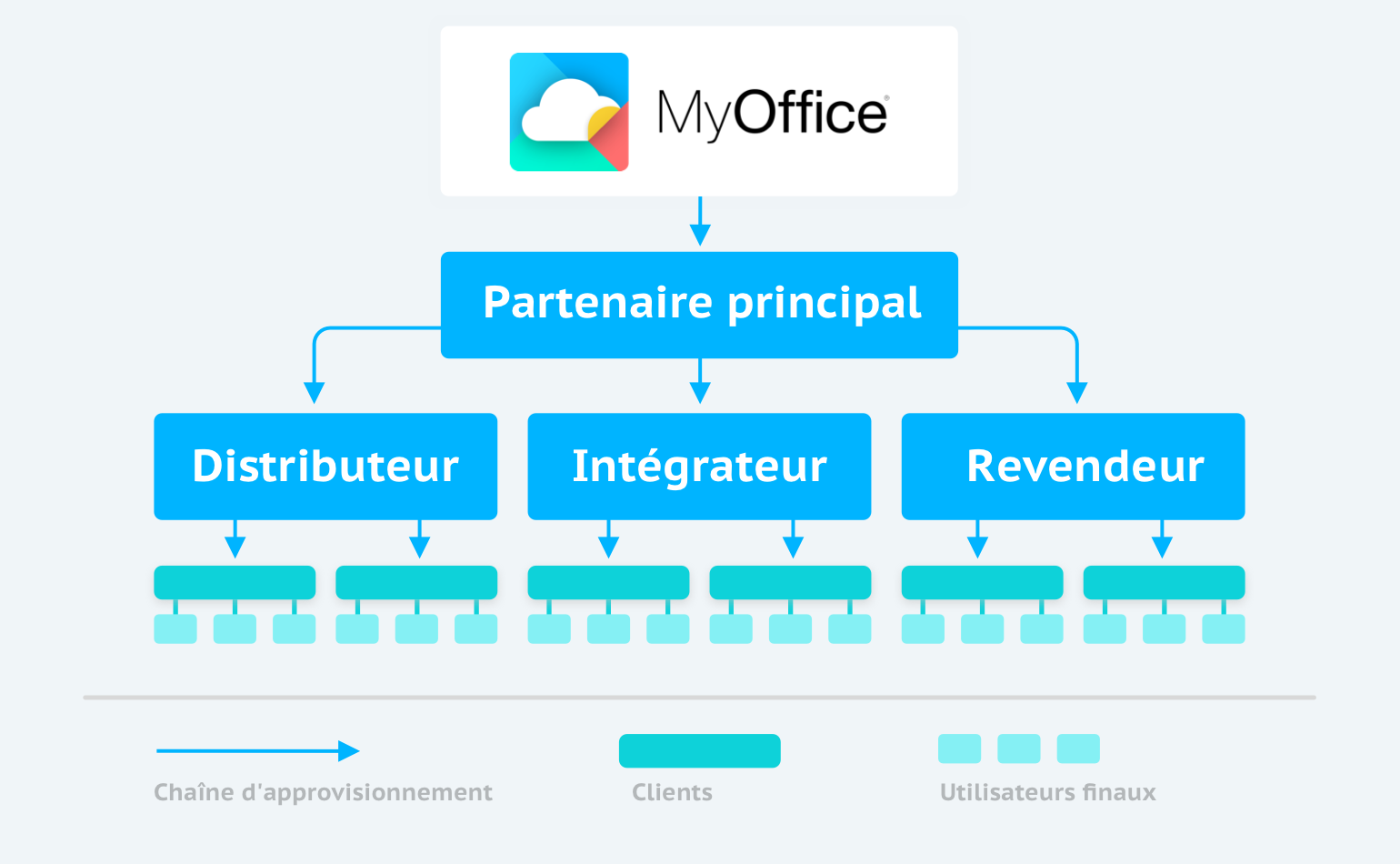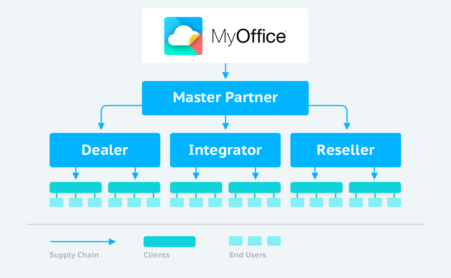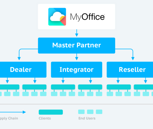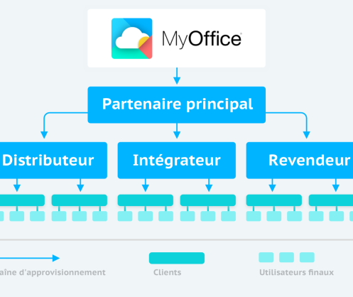 Pour la réalisation de leurs tâches, les partenaires formeront un deuxième niveau de chaîne avec les acteurs du marché local, les intégrateurs, les revendeurs et les fournisseurs de solutions informatiques. Nous envisageons un schéma classique d'interaction pour la fourniture de licences sur le marché des logiciels : MyOffice, en tant que fabricant de plateformes de bureau, développe et améliore le produit, le partenaire principal est responsable de la mise en œuvre des licences dans la région en stricte conformité avec les KPI, alors que les entreprises locales sont directement impliquées dans l'implantation, l'assistance technique et la formation du personnel sur le terrain.