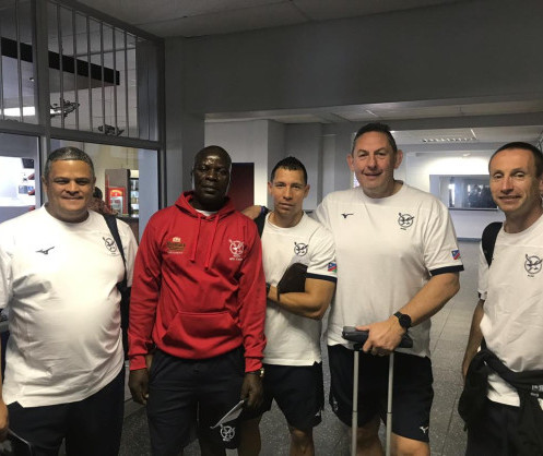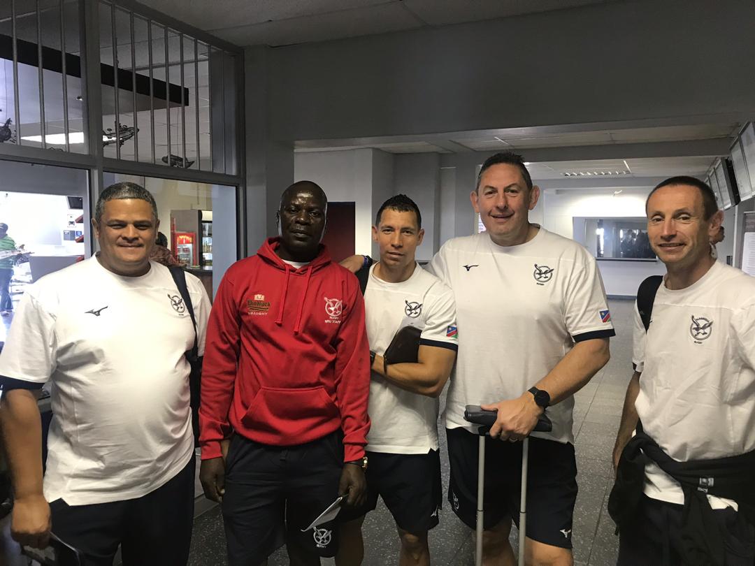 • Left to Right: Irvin Newman - Namibia Team Manager, Elias Viho - Namibia Kit Manager, Serio de la Harpe - Namibia Strength & Conditioning Coach, Phil Davies - Namibia Head Coach and Director of Rugby, Wayne Proctor - Namibia Head of Physical Preparation