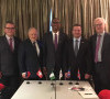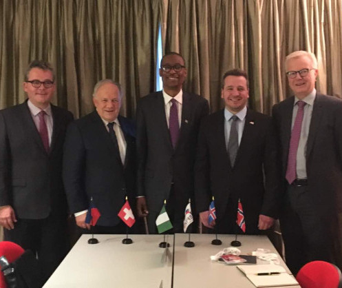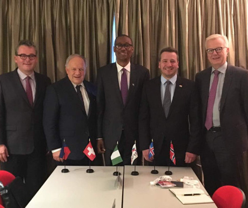 • (Left-Right) Ambassador Peter Matt of Liechtenstein, Federal Councillor Johann Schneider-Ammann from Switzerland, Nigerian Minister of Industry, Trade and Investment Dr. Okechukwu Enelamah, Minister for Foreign Affairs and External Trade of Iceland, Mr. Guolaugur Por Poroarson and Ambassador Harald Neple from Norway after the signing of the Joint Economic Cooperation between Nigeria and the European Free Trade Association (EFTA) in Buenos Aires, Argentina on the Sidelines of the World Trade Organisation (WTO) 11th Ministerial Conference