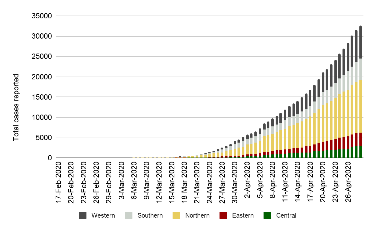 • Graphique 1: Nombre cumulé de cas confirmés de COVID-19 signalés par région, 17 février - 28 avril 2020